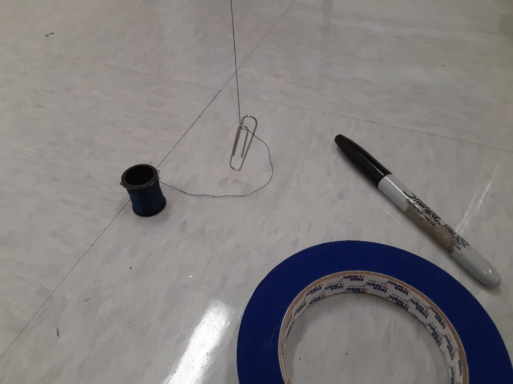 To accurately place the target below the launch point, hang a mass (e.g., paperclip) on a thread from the ceiling to directly above the floor, then mark the floor. This mark will be the center of your target. The eventual drop height of 200 cm works well to test for the optimal relationship between blade length and accuracy.